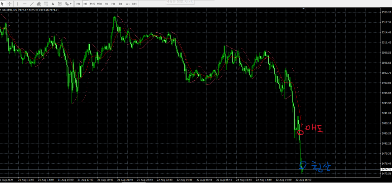 메타트레이더 MT4 8월22일 해외선물 금달러 XAUUSD M5차트.